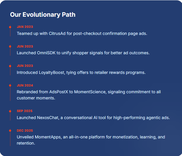 - By June 2024, we rebranded from AdsPostX to MomentScience. This wasn't just a name change; it signaled our broader commitment to all kinds of customer moments (post-transaction, order status, customer service, even the front door). The chemistry might differ by placement, but our platform lets you run them all in one place.